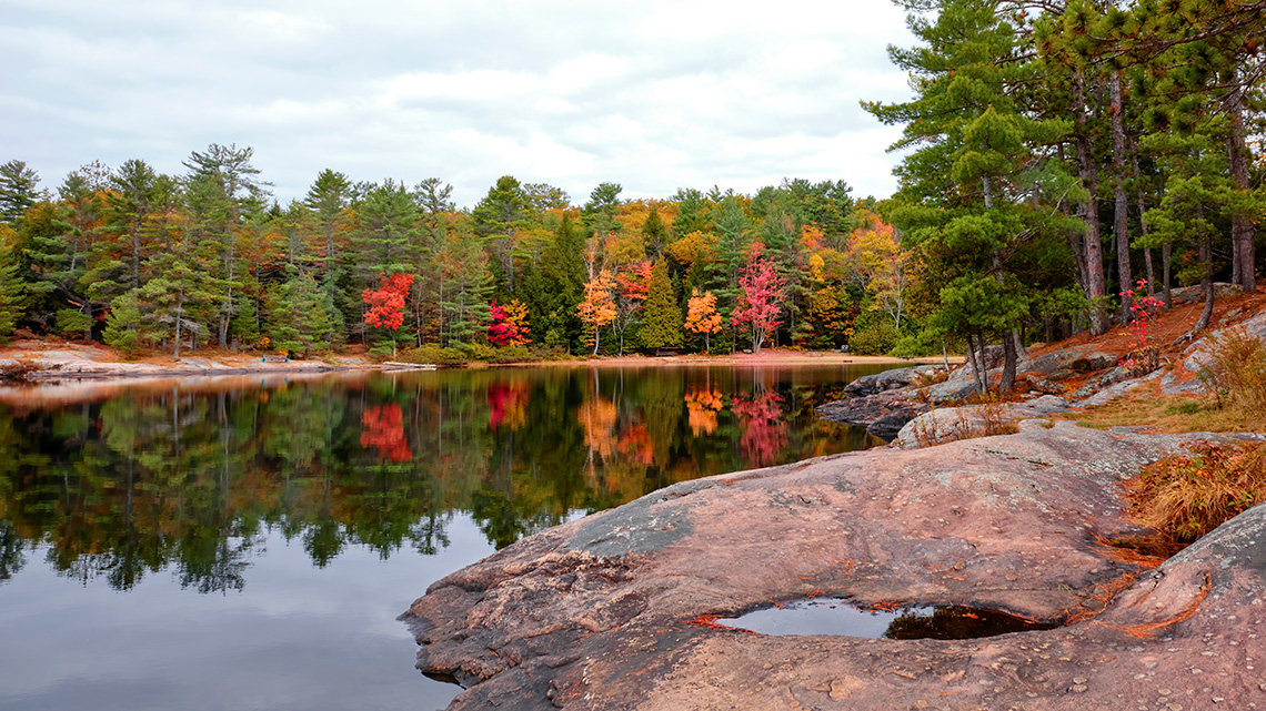 In this image of Silent Lake Provincial Park, in southeastern Ontario, there are physical characteristics typical of the Canadian Shield, such as hard rock formations, granite, lakes, and forests.