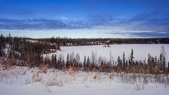 A treeline of Madeline Lake and a small island near Yellowknife in the Northwest Territories, Canada